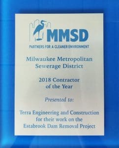 Terra would like to thank the Milwaukee Metropolitan Sewerage District for their 2018 Contractor of the Year Award for our work on the Estabrook Dam Removal Project. Many years in the making, the removal of the Estabrook Dam is a win for the city of Milwaukee, the river and the community as a whole. Learn more at milwaukeeriverkeeper.org